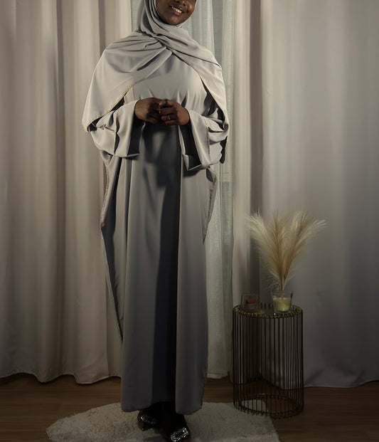Abaya voile Intégré gris en soie de médine – Élégance et Praticité
