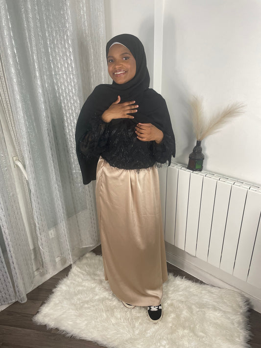 Abaya Nafissa Tall noir satin brillant ceinturée